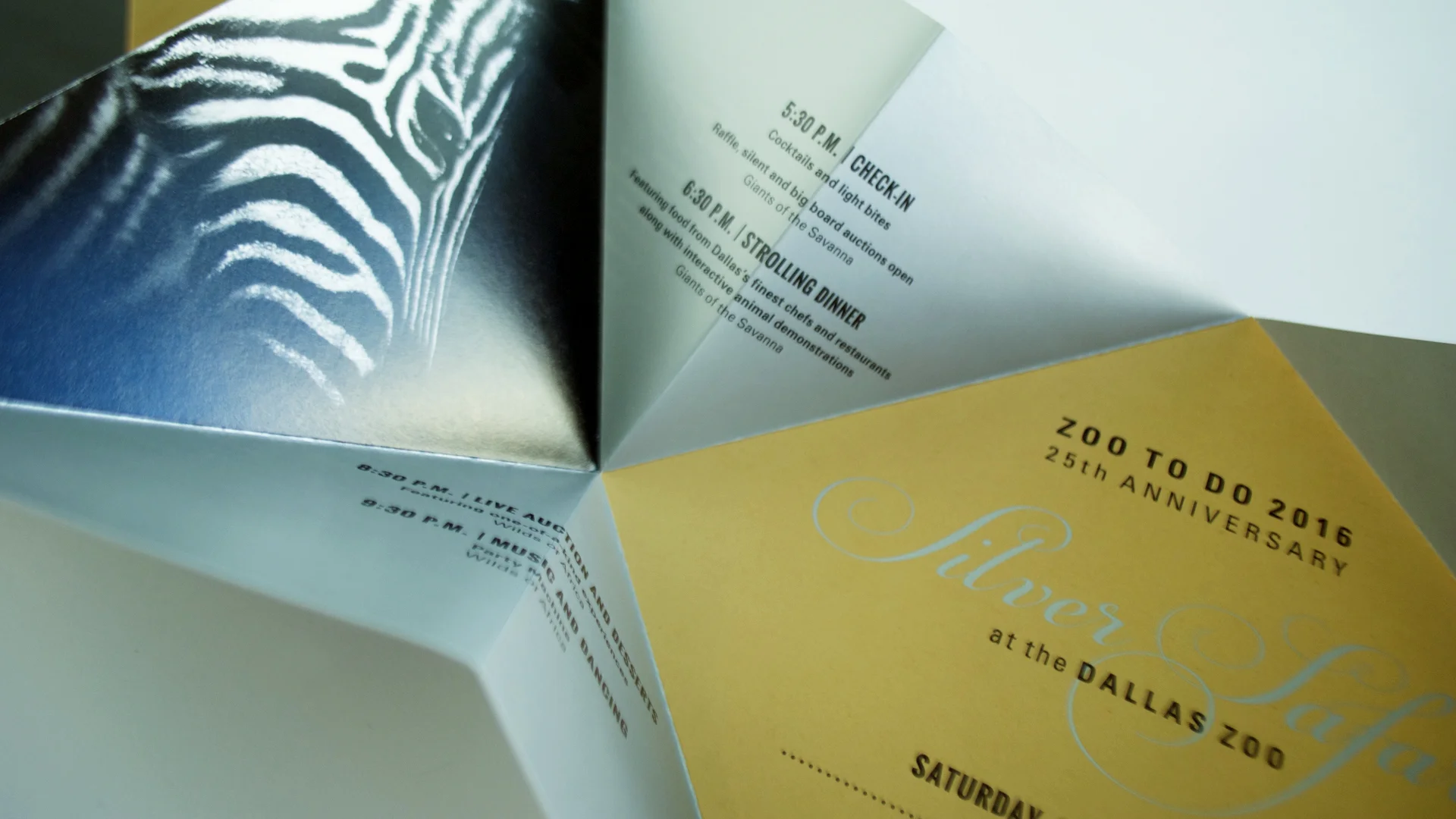 In honor of the 25th anniversary of the Dallas Zoo To Do, the event theme was Silver Safari. Using origami, animals and light touches of silver ink in the printing process, the theme was brought to life through the invitation design.