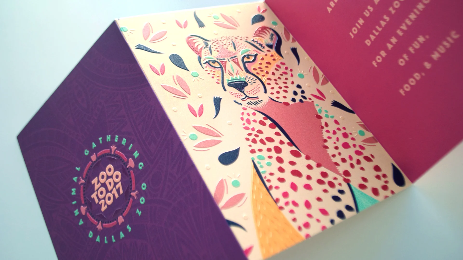 The Dallas Zoo To Do theme for 2017 was “Animal Gathering”. To bring this theme to life in the invitation design, custom animal illustrations were paired with a bright and bold color palette. With so many textural elements included in the design, actual texture was added in print production giving the invitation an additional surprise element. The invitations were mailed out to the Dallas Zoo donors in bright magenta envelopes ahead of the big night.